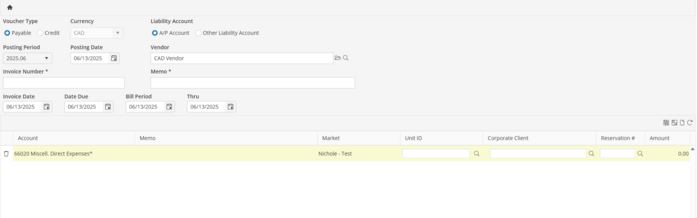 The currency of the manual Payable Posting is determined by the Vendor selected. This will be displayed in the Currency Field. The currency may not be changed on the Payable Posting.