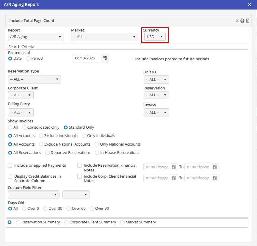 The A/R Aging report can only be run by a single currency at a time. If a currency other than the base currency is selected, the User may choose the option to convert the A/R Aging to base currency. Amounts displayed are based on the exchange rate at which the invoice posted.