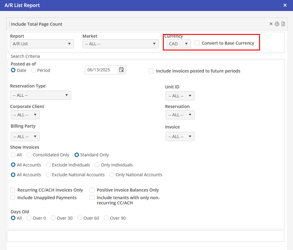 The A/R List report can only be run by a single currency at a time. If a currency other than the base currency is selected, the User may choose the option to convert the A/R List to base currency. Amounts displayed are based on the exchange rate at which the invoice posted.