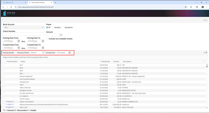 Select ACH transactions : Populate the line item(s) to be voided. Multiple items may be selected for voiding at the same time. At any time, click on the check number in the Check No column to see the ACH detail.