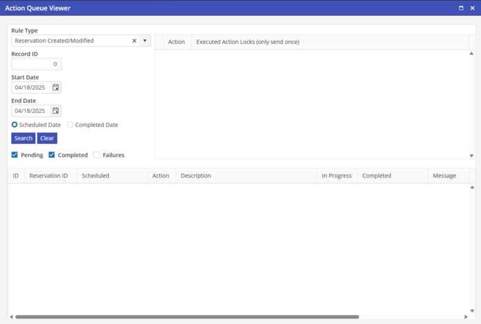 The Rules Engine Action Queue is accessible from the Settings > Rules Engine > Action Queue. If accessed from reservations, then the reservation will be auto-populated and the dates are not necessary. If accessed from settings, then the reservation field will be blank and the dates must be utilized. If a reservation is edited and an email is queued with a scheduled date prior to today, the application will automatically send these emails.