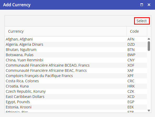 Find the currency on the Add Currency list, click to highlight the Currency, then click on Select.