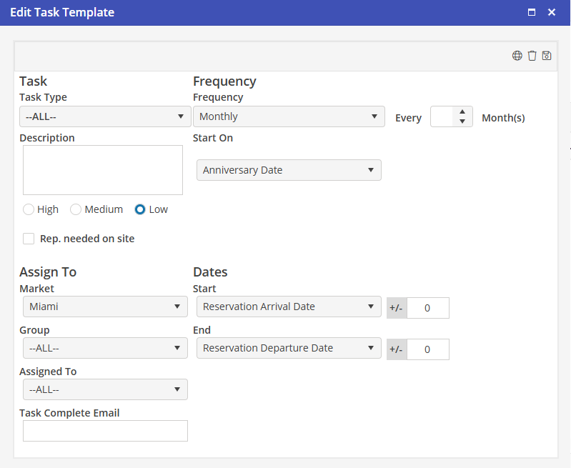 Setup the Task as it normally would be entered. Keep in mind that Users will be selecting a Template and not verifying the start dates for Tasks. This process may require some Task management to make sure that a Housekeeping Task does not end up on a weekend.