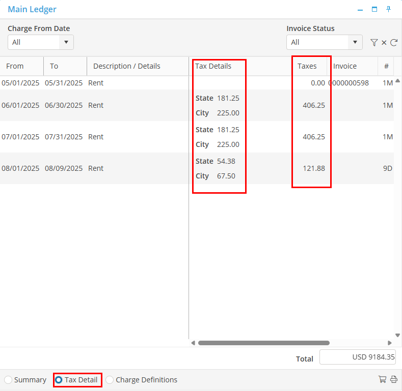 To verify that the Taxes are being applied, go to the Resident Ledger and select “Tax Detail”. The User will seethe columns for tax details as well as the total amount for taxes.
