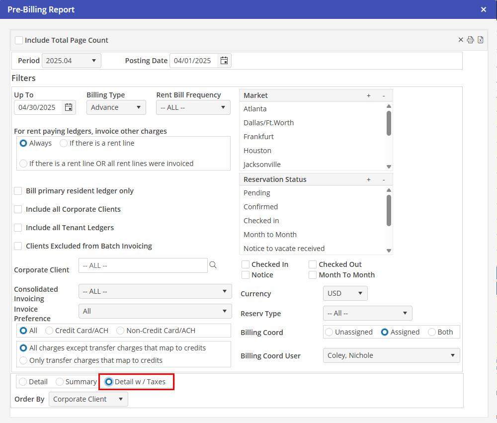 Check that all taxes are entered and reporting properly on the Reservations. When all booked Reservations have been updated, print the Pre-Billing report (located: A/R > Pre-Billing Report) with the button “Detail w/Taxes” checked for the next billing cycle. Audit each Reservation for the percentage tax item as well as the Other Charge Tax item that was added for the room tax.