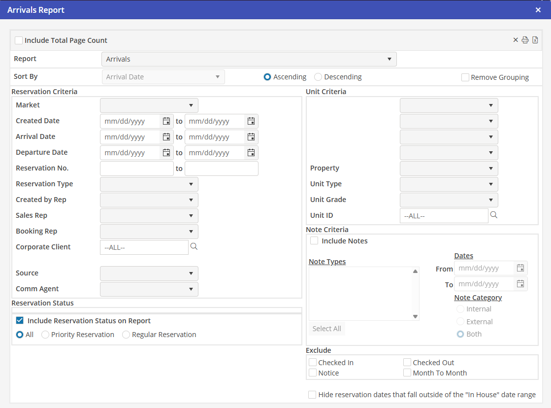 Using all, none, or a combination of the system filters in the Reservation and Unit Criteria sections, create a comprehensive arrivals report.