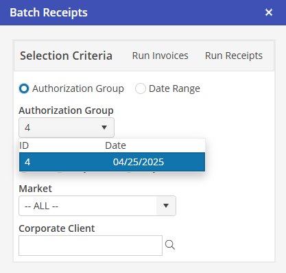 Select “Authorization Group” to perform Batch Receipts for a recently completed Group Authorization posting. Click the drop down to view all Authorization Groups and the Date and Time performed. Selecting an Authorization Group will only process Batch Receipts for postings contained within that Authorization Group.