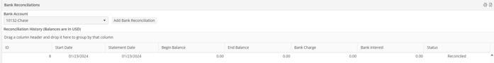 On the Bank Reconciliation screen, select the Bank account that contains the Beginning Bank Statement Balance. Select