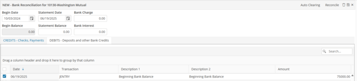 On the “DEBITS-Deposits & Other Bank Credits” tab, select the Beginning Balance Journal Entry.