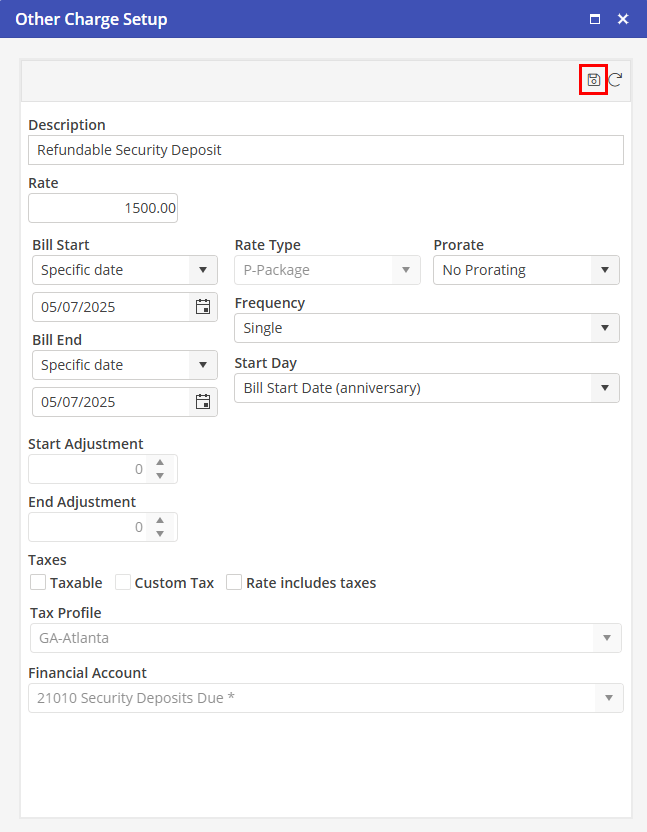 Other Charge window will open, type in the amount of the Deposit in the Rate field. When finished entering the information, select
