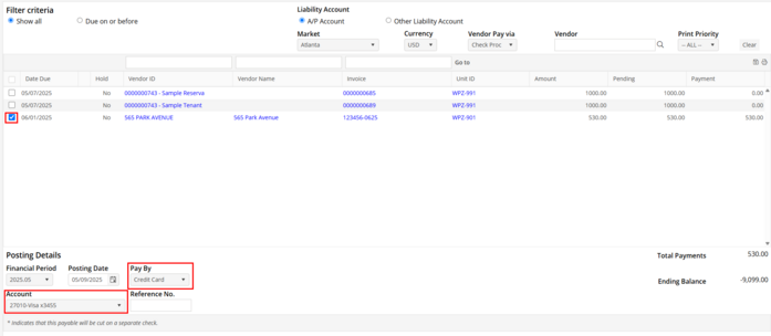 Using the receipt from the credit card transaction, create a Payable choosing the Vendor that the goods were purchased from. Post the Payable on the same day that the credit card was used. Each Credit Card swipe must be entered as a Payable.