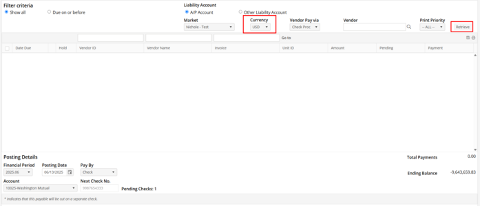 to load the associated Payables. The Account listed will default to the first Bank Account associated with the Currency selected. Change as necessary.