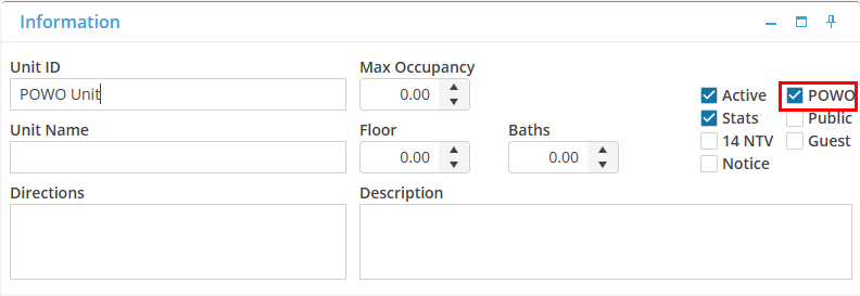 To select which units the POWO will apply to, simply open up the unit and select the check box in the upper right hand corner of the Information Card within the Unit Record. This will allow the A/P Batch Posting process to differentiate between a POWO Unit and a Non POWO Unit.