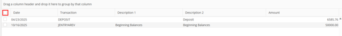 Click the checkbox header to clear (populate) all items (Debits and Credits) on the Bank Reconciliation. Click again to un-clear (unpopulate) all items (Debits and Credits) on the Bank Reconciliation.