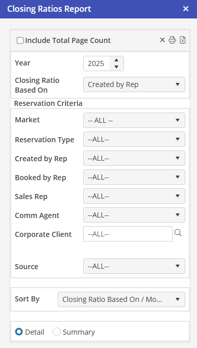 For example, if the selected “Closing Ration Based On” is Corporate Client and the selected sort option is “Closing Ratio Based On, Month,” the report will contain a single line for each Corporate Client, along with the sum of totals for all of the months for that client.