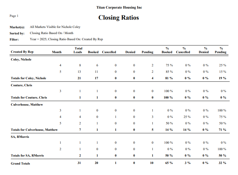 If the selected sort option is “Month, Closing Ratio Based On,” subtotals are provided for each month.