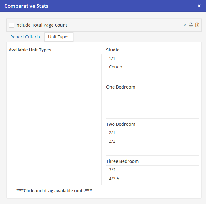 Users must first “map” their specific Unit types to these types (i.e. the types 2 BR / 1 BA and 2 BR /2 BA would both map to “two bedroom”) in the “Unit Types” Tab.