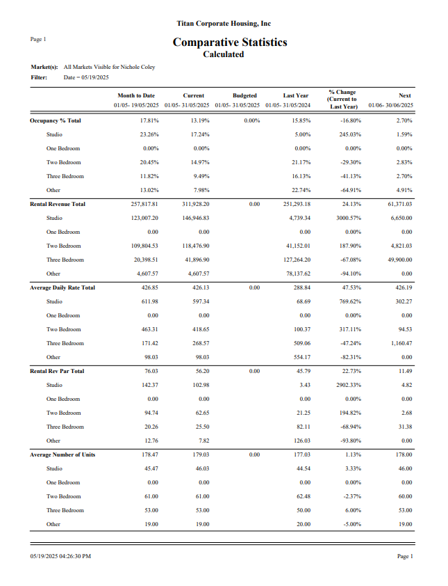 This report contains the following data for each Unit type (along with the total for all Units types) for each date range, and the totals only for the month budget.