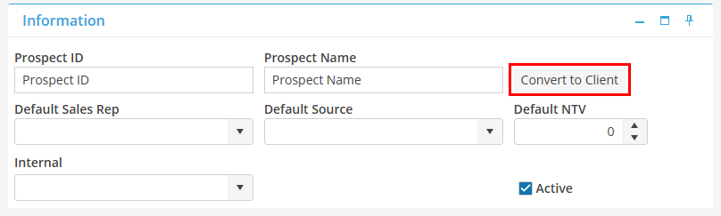 To convert a Prospect to a Corporate Client, click the button to Convert to Client button in the Information Card.