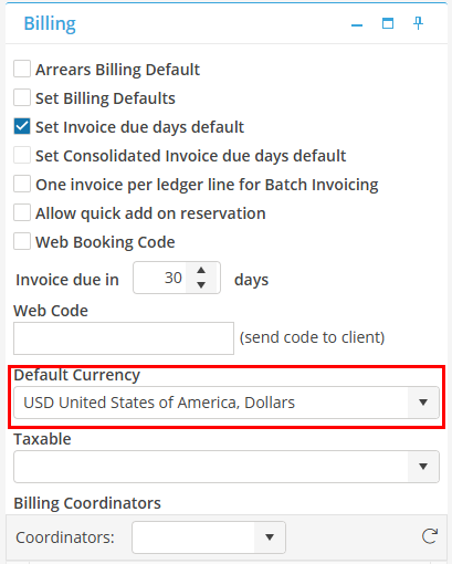 Located on the Billing Card in a Corporate Client record, a default currency may be stored for each Corporate Client record. This default will automatically populate to a Reservation when the Corporate Client is selected on the Reservation or Lead. Currencies available for selection will be from the Active Currencies.