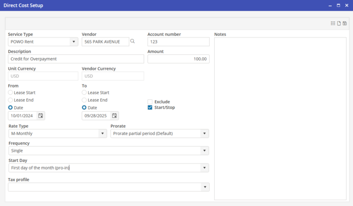 When crediting rent created with POWO, it is necessary to create a “One Time” Unit Direct Cost payment. This will need to be a negative amount, and the same Service Type will need to be selected here that was initially selected when creating the rent. In addition, there will need to be a reservation on the unit that has dates within the financial period that the credit is for, and the To and From dates will need to be the same date. If the credit is for a range of dates, we recommend typing that in the description field.