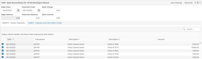 Credits - Checks, Payments For Checks, select the detail for all checks entered. The Uncleared Items and Deposit Cleared items (if it exists) should not be selected.