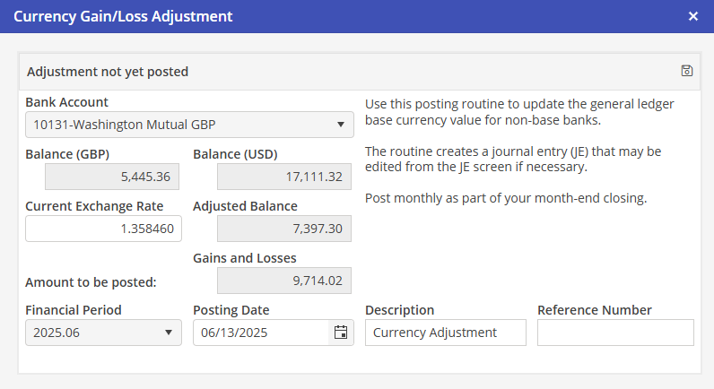 Located in Banking > Currency Gain/Loss Posting: use this posting routine to update the G/L base currency value for non-base banks. This routine creates a journal entry that may be edited from the journal entry screen if necessary. Post this monthly as part of the month end closing.