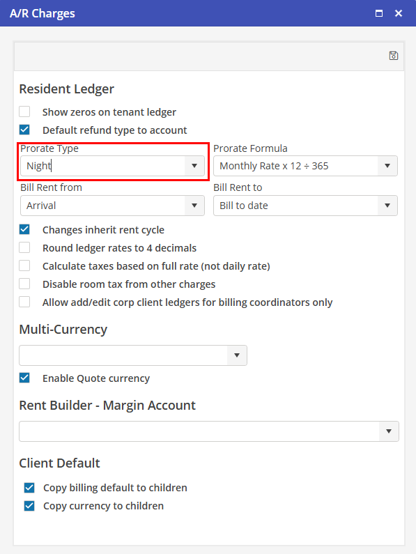 The following procedure must be used when changing the Resident Ledger Prorate Type setting from Daily to nightly. This will eliminate the need for changing the “Bill To” date on Reservations to a day before the Reservation Departure Date.