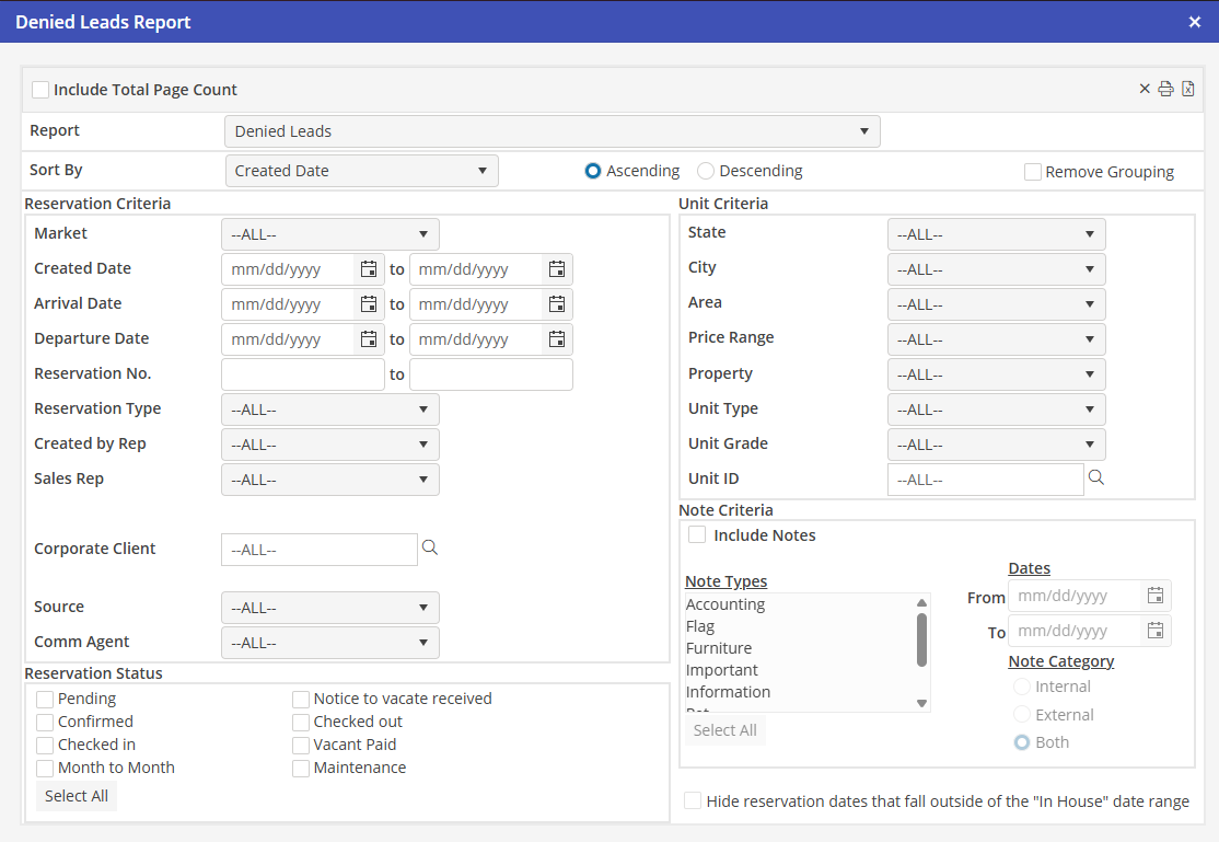 Using all, none, or a combination of the system filters in the Reservation and Unit Criteria sections, the User can create a comprehensive report.