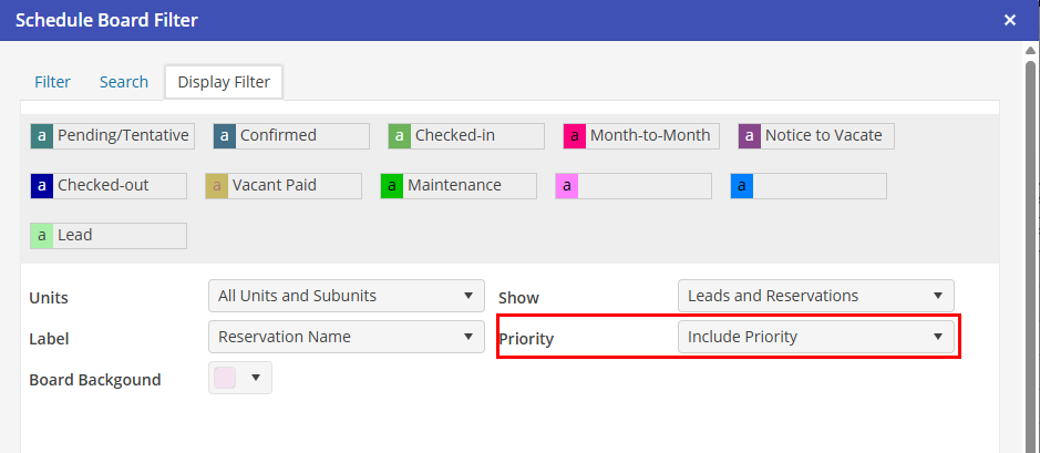The Schedule Board may be filtered by Priority Reservations by using the Display options; No Priority, Include Priority or Only Priority.