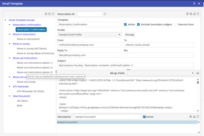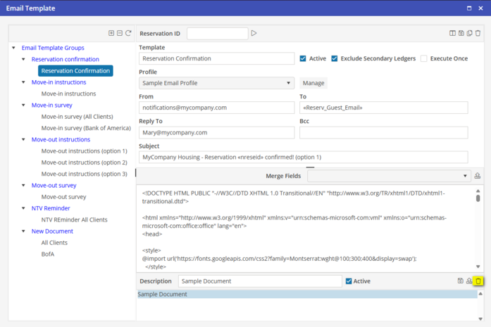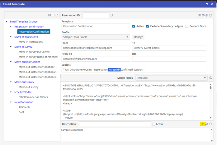 The Merge Field will appear in the selected field. When the Email Template is emailed, the system will merge the Email Template with the associated Reservation. When complete with the Email Template, select “Save” to save the Email Template.