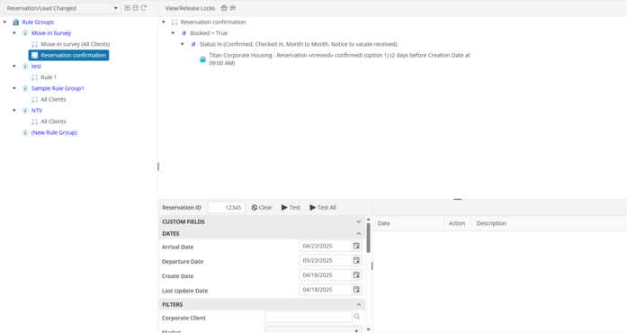 To test an Email Template that has been saved, select the Email Template from the Email Template Groups Tree. Enter the Reservation number that you would like to use for testing purposes. Click the “Test” button. The Rules Engine will populate the Email Template with the details from the associated Reservation. Then email to the associated email addresses.