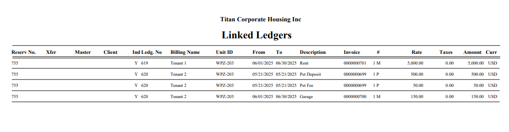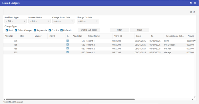 Once you have made your filter selections, click “Filter” to populate the grid below. The option to print/preview or export the data contained in the grid is available. The sorting will be the same sorting per the grid. Print the Linked Ledger which will act as a summary statement for associated Multi-Reservation Tenancies.