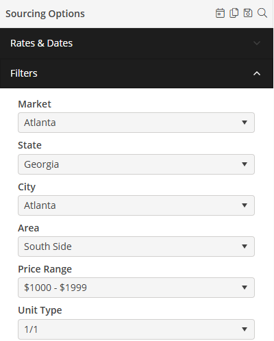 The Units and Attainable Properties displayed for the Sourcing Options will be based on these filters. These filters will populate initially from the associated Lead. If any changes are made to the Filters on the Sourcing Options, they will only apply to the Sourcing Options, and will not be written back to the Lead. If the filters change on the Lead record, they will only apply to the Lead record and will not be written back to the Sourcing Options.
