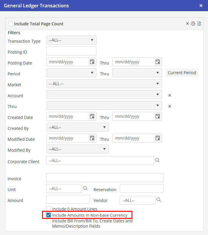G/L Transactions Located under Financial > Reporting > G/L Transactions, the option “Include Amounts in Non-base Currency” has been added. Selecting this will display the Currency, Exchange Rate and the Non-base Debits and Credits.