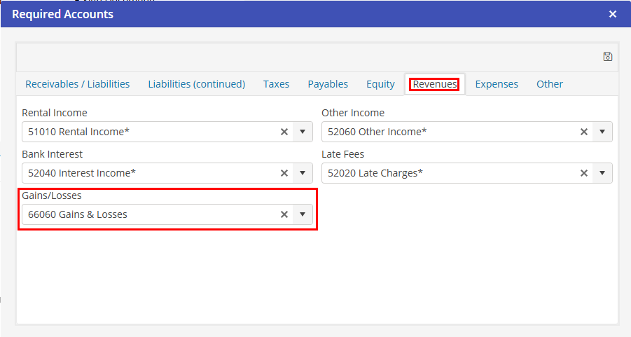 Add a new account “Gains/Losses" to the Chart of Accounts (COA). This account should be a revenue account. If it is necessary to see on the P&L by Unit report, select Operating Expense as the Category.