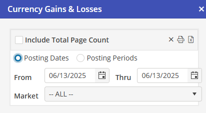 Located under Financial > Reporting > Currency Gain/Loss, the Currency Gains & Losses report monitors the Gains/Losses required account. Process the report by Posting Dates or Posting Periods.