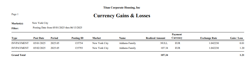 The Realized amount is the amount posted to the ledger in the base currency. If there is a difference in the currency exchange rate, the posting will be included on the report, and the Gain/Loss amount will be listed.
