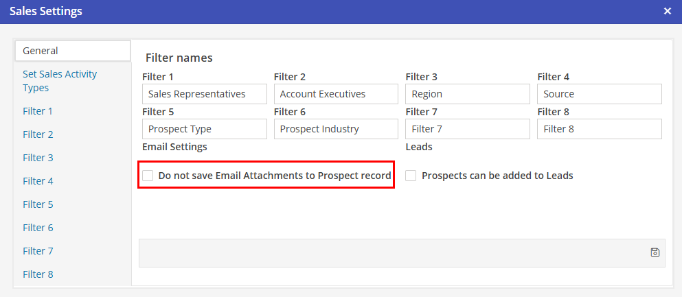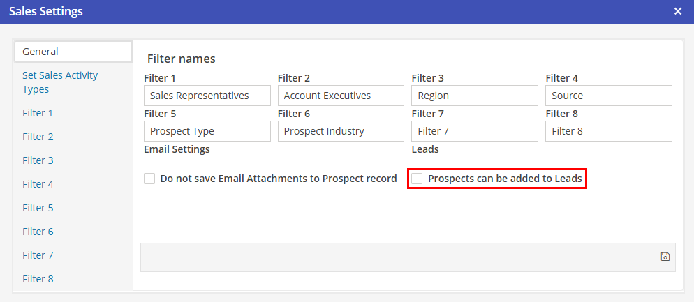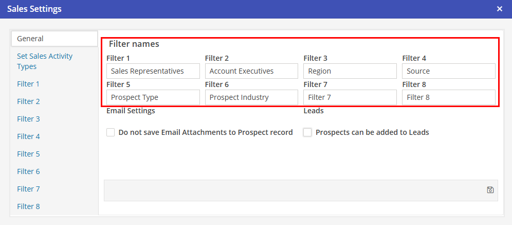Name the Custom Filters 1 through 8. Recommendations for these Fields are Sales Representatives and or Account Executives, Region, Source, Prospect Type, Prospect Industry Etc. A Source list is not included in the standard Sales Module fields. If this is required, it must be added as one of the eight filter options.