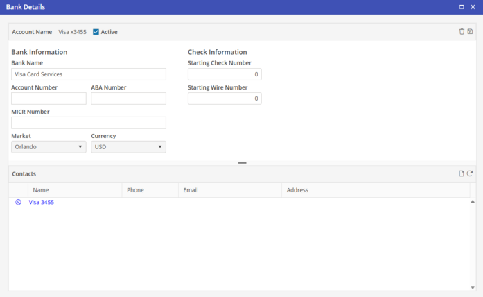 Fill in the credit card company detail in the Bank Name field and choose a Market to associate with the card. The card may be used in any market, this will be the default when this card is selected.