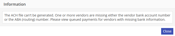 On clicking this command, the system will check to make sure that all vendors to be included in the file contain an entry for both vendor bank account number and ABA (Bank ID for routing). If not, the system will display the below message directing the user to view the queued payments screen, which indicates if vendors are missing data in either of these fields.