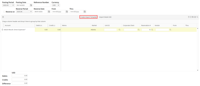 Import Template - After the Excel import template has been completed, click to create a new Journal Entry. Click to import the Excel import template. Select the Excel import template from the location where it was saved. The Journal Entry detail will now load into the Journal Entry screen. Edit Journal Entry detail lines if needed. If a Unit is selected on a line and the Market does not match, the Market will take precedence and the Unit will be removed.