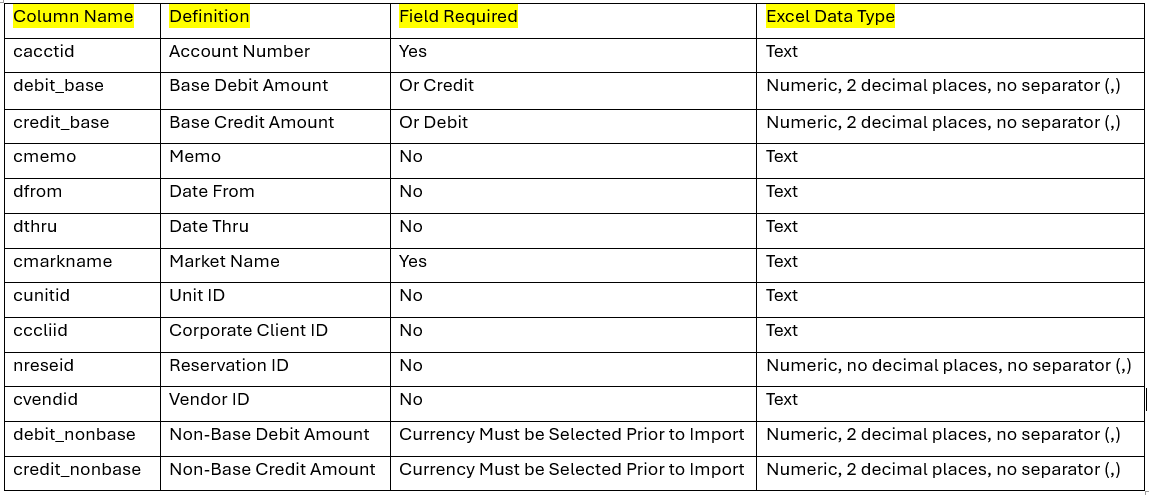 Populate Template - Using the Import Requirements below, populate the fields on the Excel import template. This may be manually updated or copied and pasted from another application or Excel file. Account numbers must not contain leading spaces to be imported correctly. If an account number has leading zeros and only contains numbers , “001001”, an apostrophe (‘) must be placed in front of the account number on the Excel import template to maintain the zeros. Example: ‘001001. Verify that the first worksheet is titled JE-IMPORTTEMPLATE. If it is not, rename it JE-IMPORTTEMPLATE. There can only be a single worksheet. Save the JE import template file. This may be saved as an .XLS file or an .XLSX file.