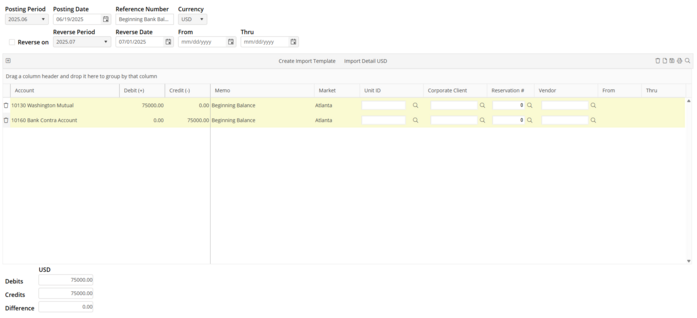 Using the bank statement from the period prior to the Go-Live date, determine the Statement Ending Bank Balance. Debit the bank account with the Statement Ending Bank Balance and credit the Bank Contra Account. If the account is negative, reverse the posting. Example: The ending bank balance is $75,000.00.
