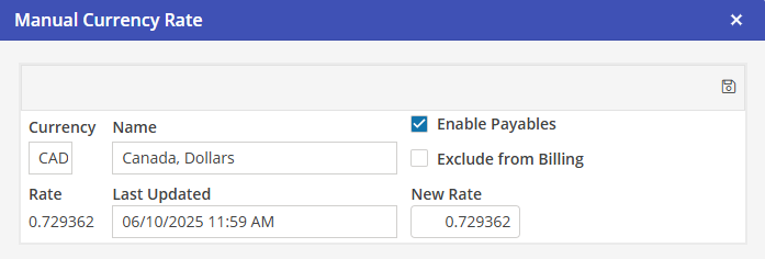 Click on the currency to update. in the Manual Currency screen, enter the new rate that was secured from the internet, click