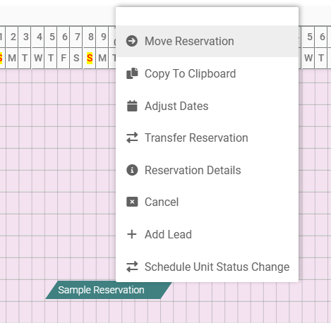 1. Single right click on the Reservation, then select Move Reservation
