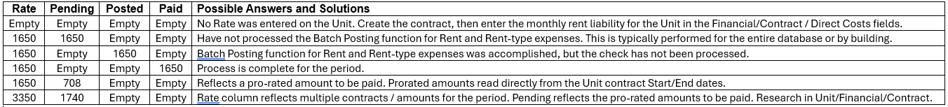Posted - amounts appear in this column after the Accounts Payable/Batch Postings process has been posted for Rent and Rent-type expenses.