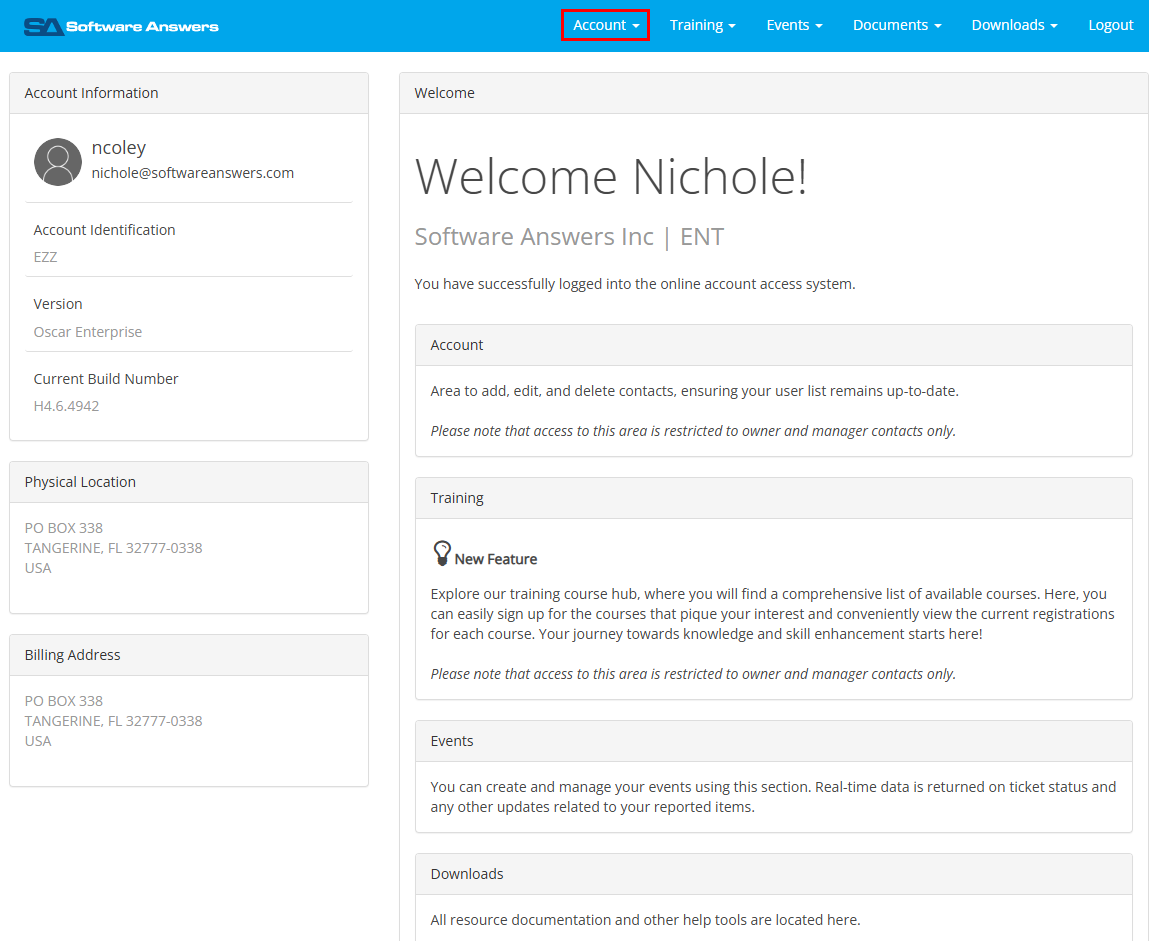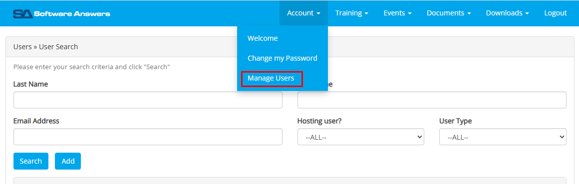 Oscar User Management From the main page of www.softwareanswers.com, locate the Account menu dropdown from the top toolbar. Once you click on the Account menu, select Manage Users.