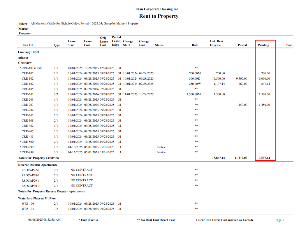 This is the Calc Rent Expense subtract the Posted amount. Variances will be displayed in this column based on unposted or over-posted rent expenses. If negative values are shown in this column, this typically indicates that more Unit Rent was posted than was expected to post.