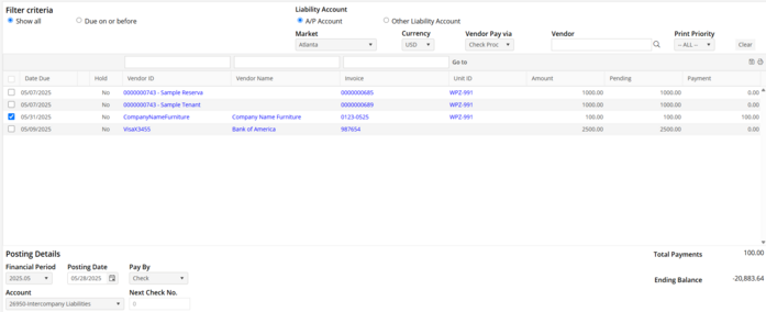 In the Check Processing screen, select ALL Markets and one of the Expense Allocation Vendors. Separate Vendors were created for the ability to select one Vendor and then “Select All” payables for Check Processing.